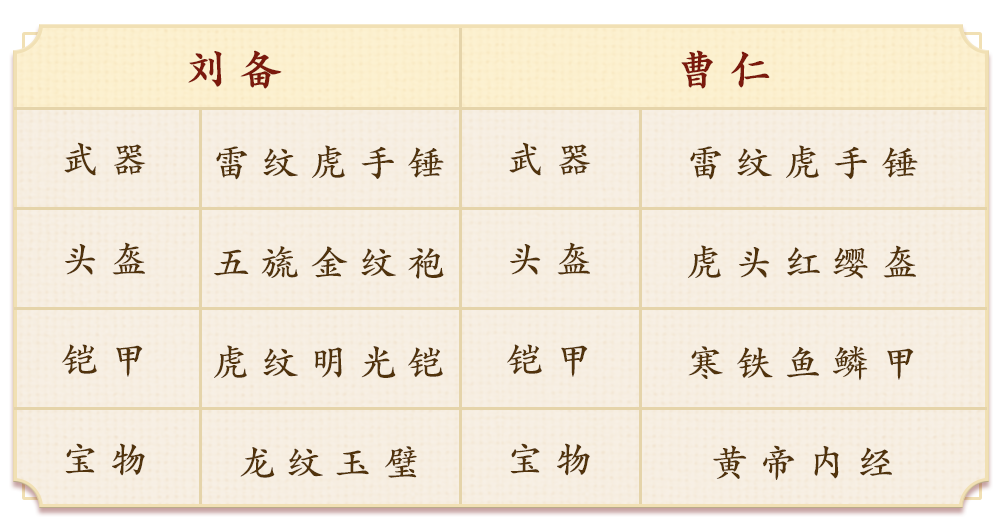此处刘备和曹仁都选择生存体系套装,尽量选择自身的专属武器洗出专有词条。