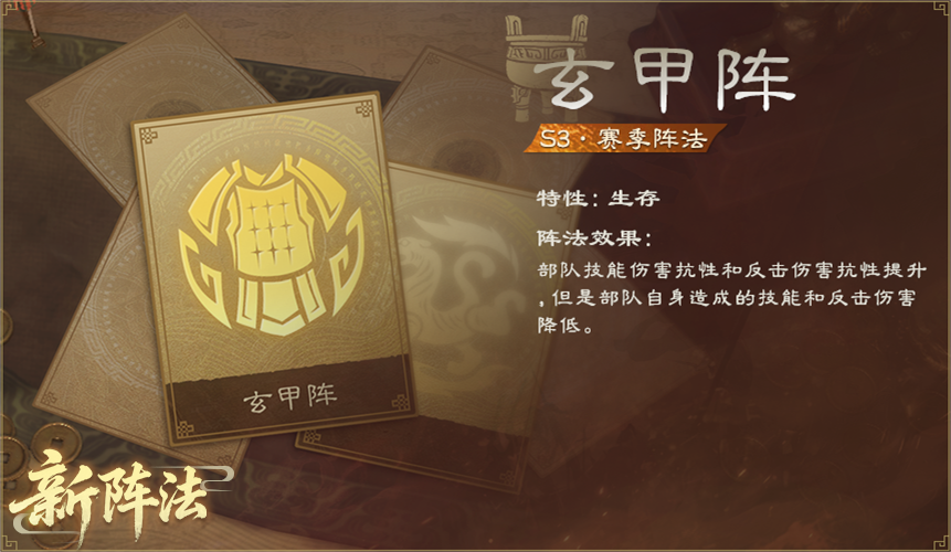 玄甲阵:生存流的极致坚守。提升部队对技能伤害和反击伤害的抗性,但自身造成的相应伤害降低。这是为持久战与防守反击战术量身定做的钢铁之阵。