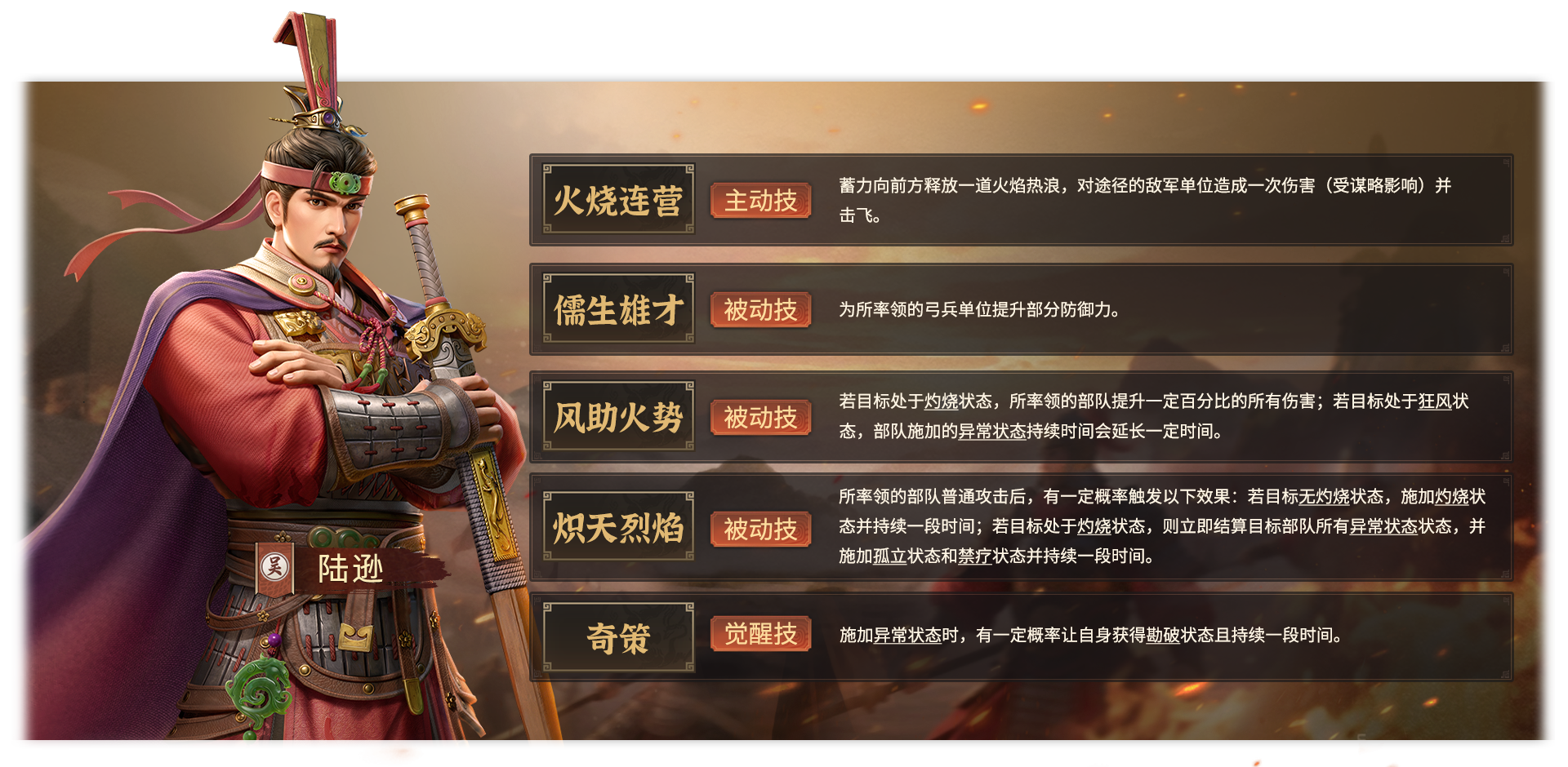 陆逊的技能设计围绕 “弓兵体系核心 + 异常控制大师” 展开,以 “火” 为核心元素,兼具控场、输出与团队增益,完美还原他 “以智谋破敌” 的作战风格。