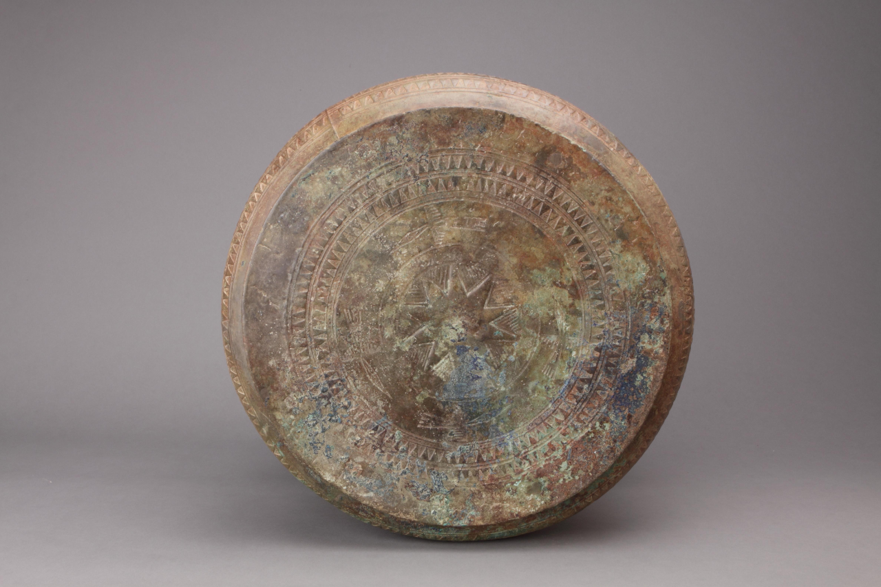 此鼓出土于云南江川李家山古墓群,为战国时期古滇国遗珍,现藏于昆明市博物馆。鼓高48厘米,底径45厘米,束腰造型沉稳雄健。鼓面中心饰凸起芒纹,象征太阳光芒普照四方,四只飞鸟首尾相接环绕芒纹,外围两道同心圆带内刻三角齿纹,纹饰繁复精妙,彰显铸造工艺之高超。
