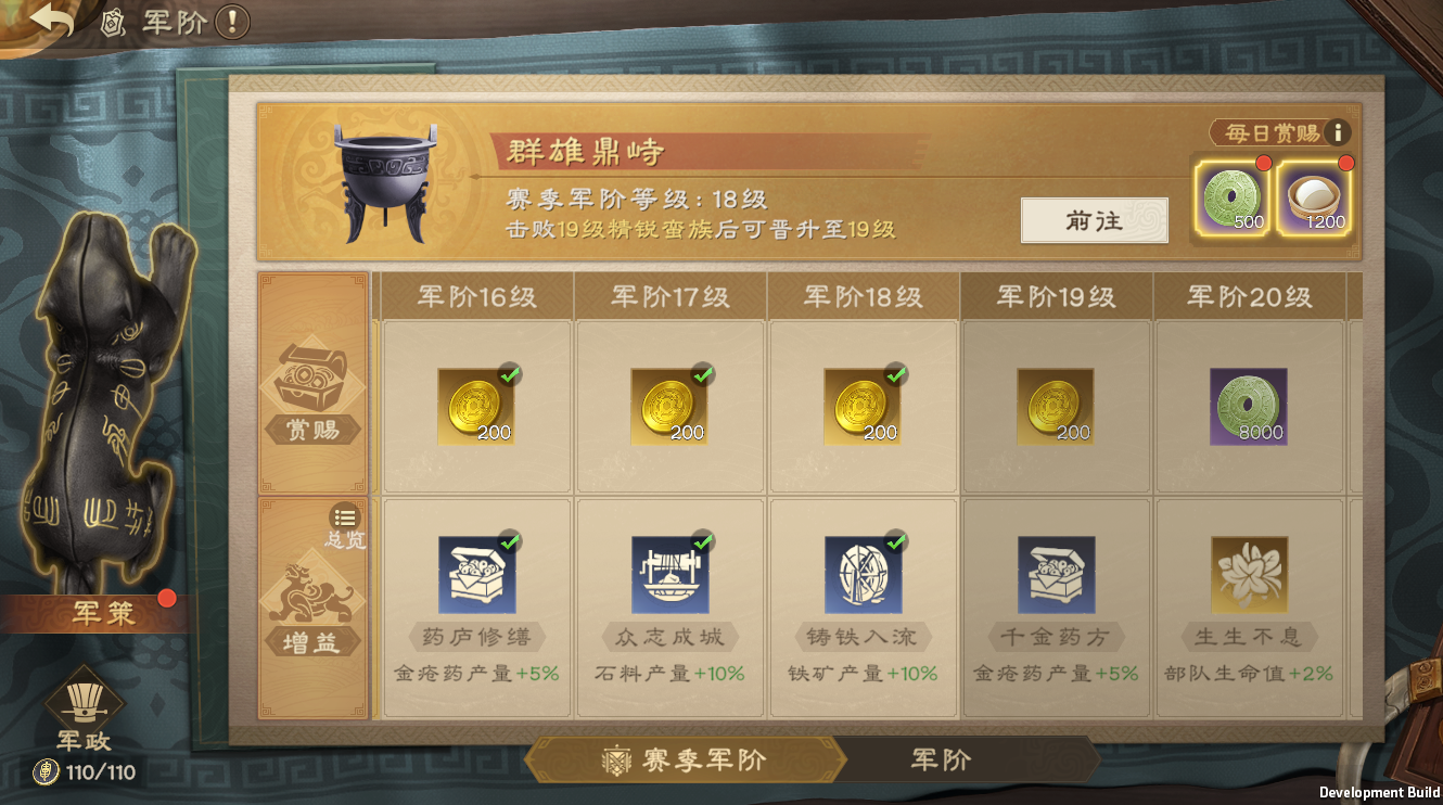 【赛季军阶】更新,击败精锐蛮族将可领取海量赛季军阶赏赐。全部通关可获得6000金铢、59英豪令以及大量增益。
