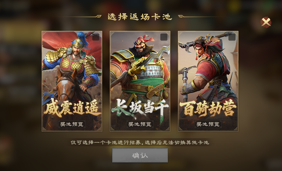 · 一旦选择要返场的限定卡池后将不可更改,请主公谨慎选择。