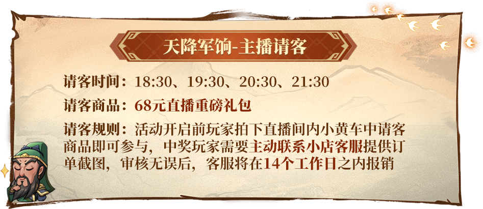 活动规则:下单指定商品,主播将在直播间半点抽取一位玩家作为锦鲤,直接请客免单!订单越多抽中的几率越大哦!