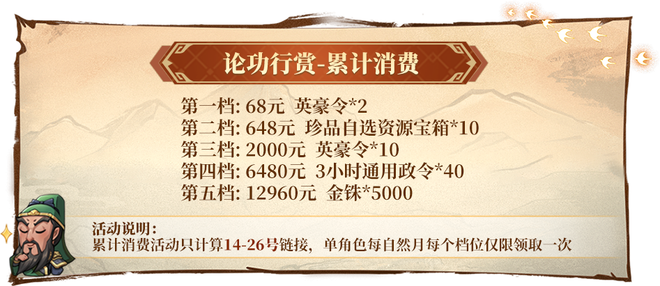 活动规则:累充玉符到一定额度后,次月账号内自动下发赠礼道具,请主公关注游戏内邮箱。