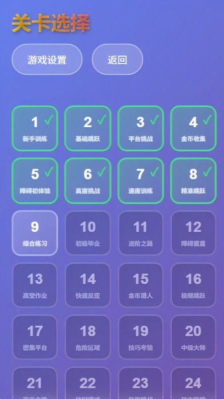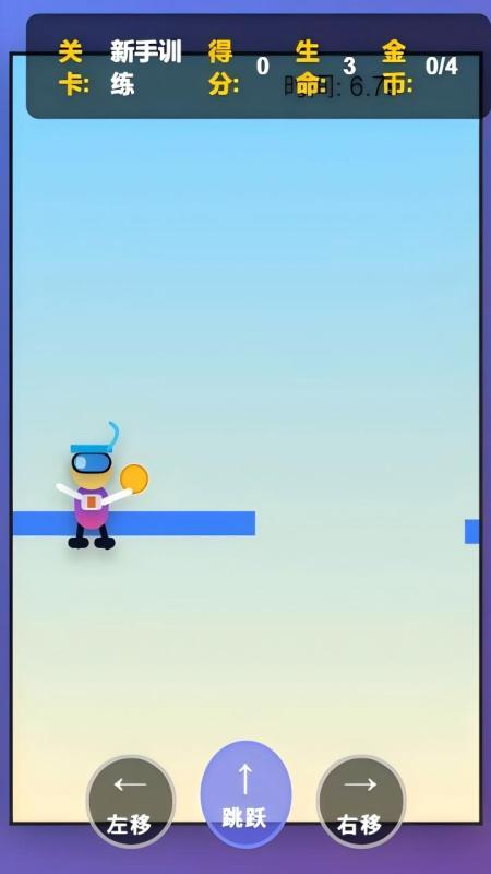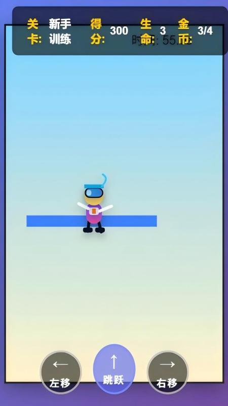 本游戏是一款平台跳跃游戏《跃动冒险家游戏》。玩家操控一个戴着护目镜的冒险者,在随机生成的平台上奔跑和跳跃。每个关卡都有不同数量的平台和高度变化,需要先收集完所有金币,同时走完所有平台即可通关。游戏包含移动端可操作的左移、右移与跳跃按钮,以及支持背景音乐播放、关卡解锁与进度保存,适合追求节奏感和操作感的玩家体验。