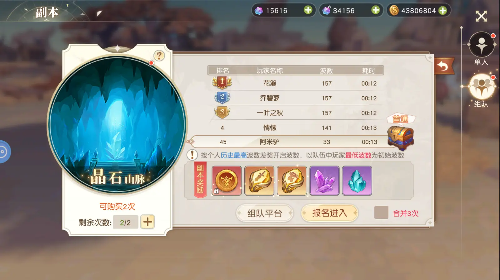 晶石山脉:组队挑战时,以队伍最低的波次记录为初始波次。