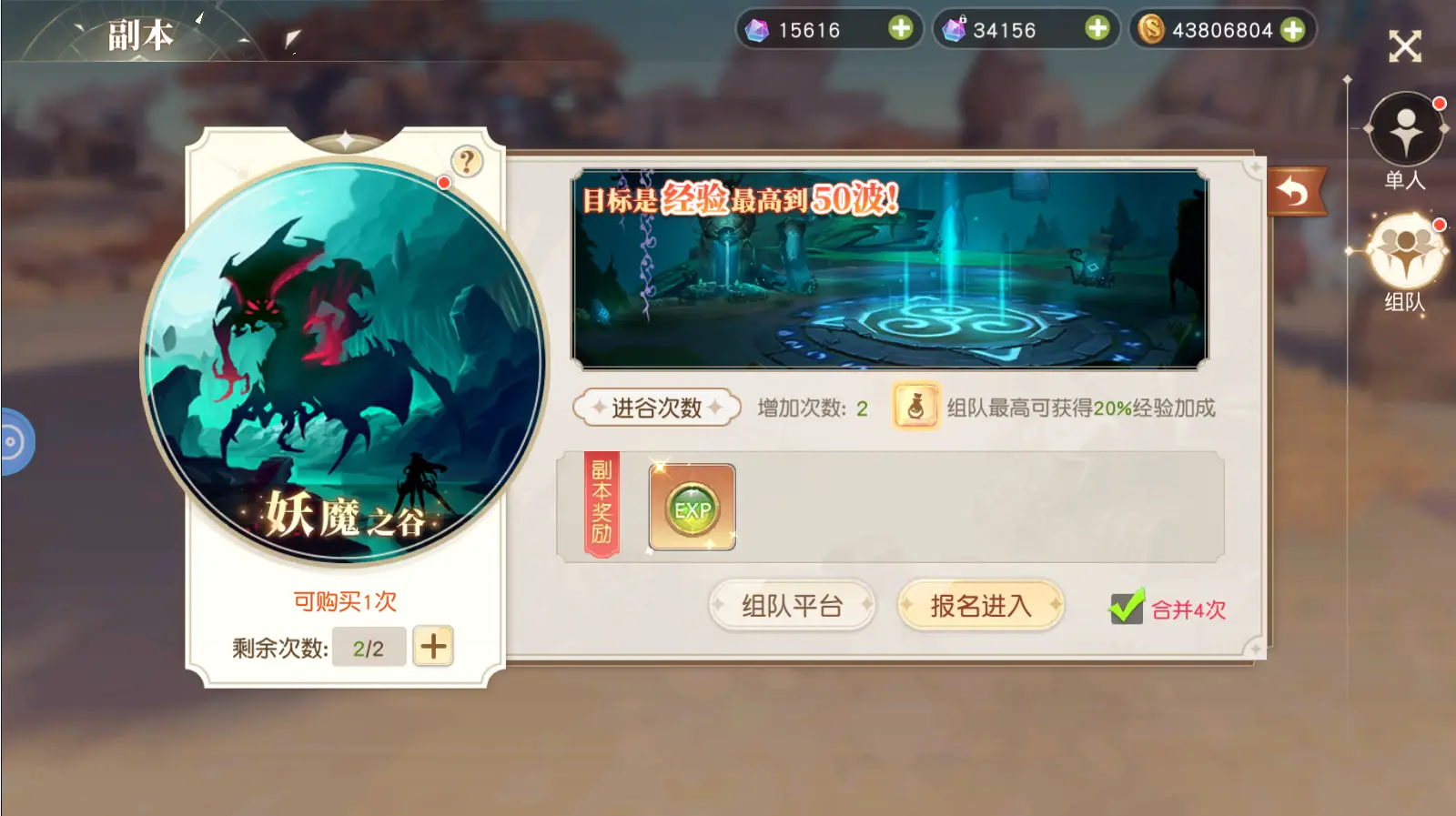组队进入副本可获得额外的经验加成,组满2人可获得20%加成。