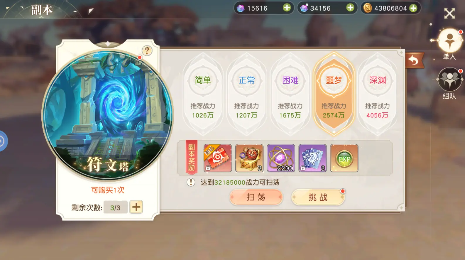 难度越高的副本奖励越丰厚,3星通关后可扫荡。