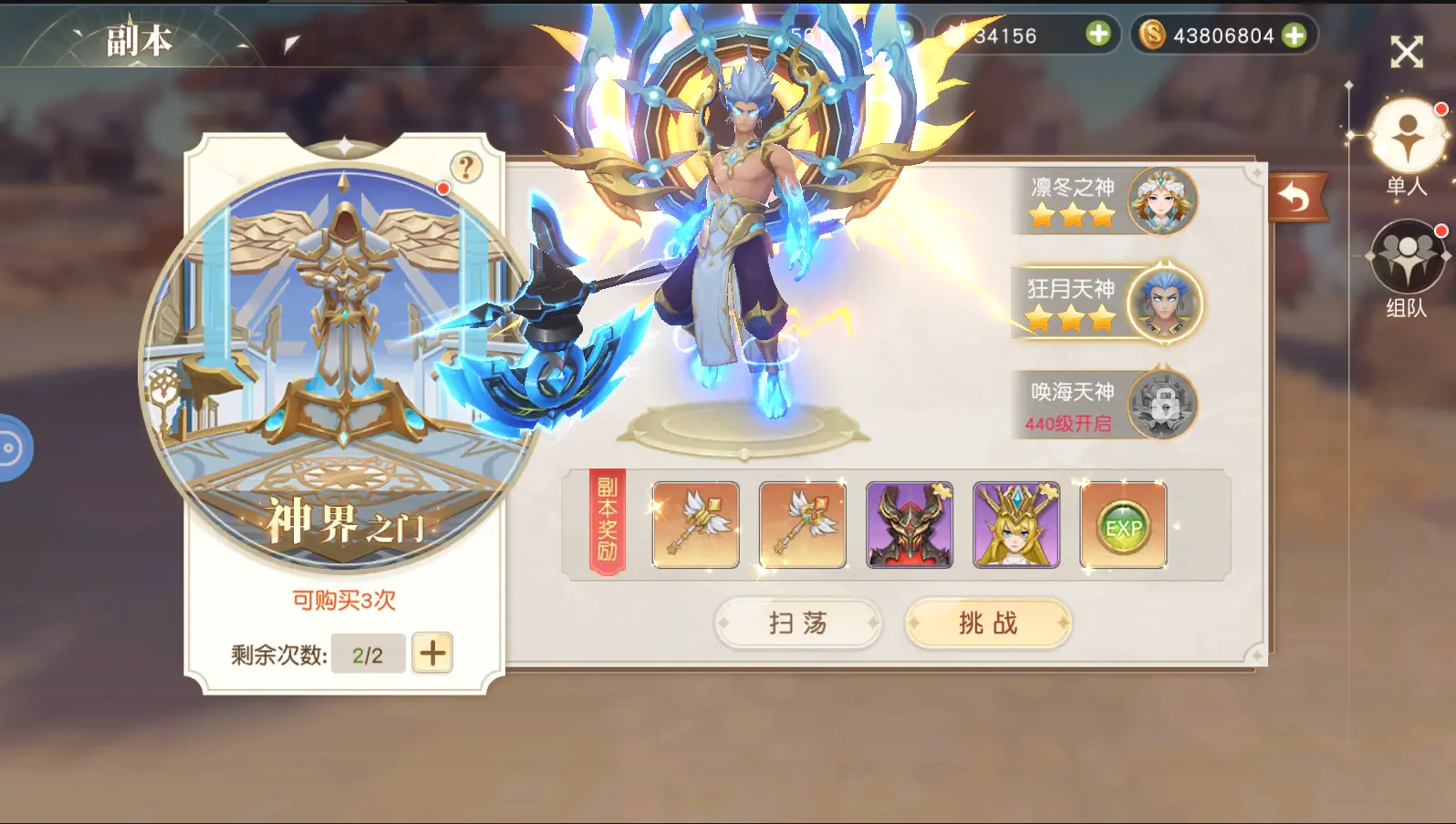 3星通关可开启下一级天神副本,并且还有额外的珍稀道具奖励。