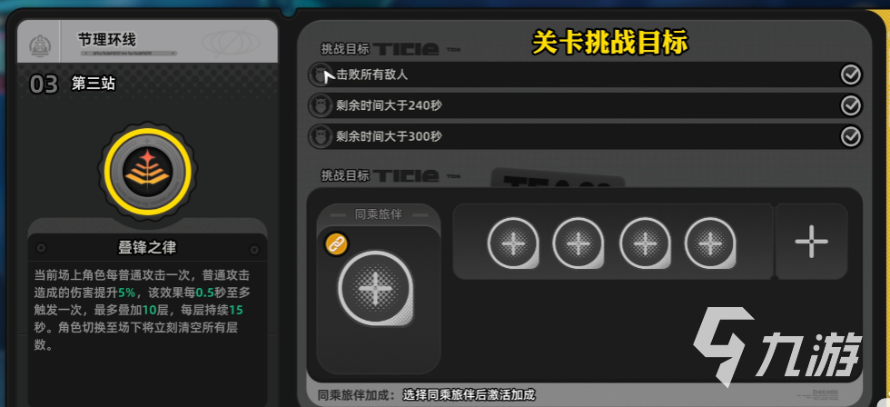 下图中关卡左下角,代表的是这关的机制加成,同样不同关卡都各不相同需要好好阅读注意,然后是同乘旅伴,这个点开后可以任意添加1名角色,能给队友带有特殊的加成效果。