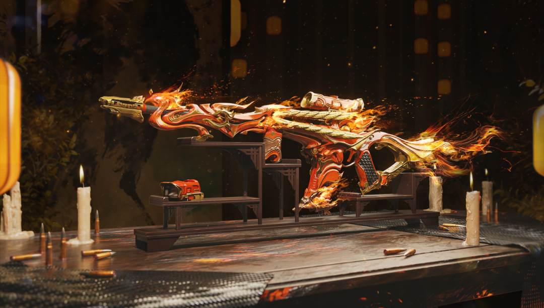 枪身的鎏金雕花与枪托处朱雀鳞片相互呼应,枪口雕琢的朱雀,宛如即将腾跃而起,姿态栩栩如生;烈焰在枪身流转、迸溅,每一处细节都镌刻着东方神韵的瑰丽与霸气!