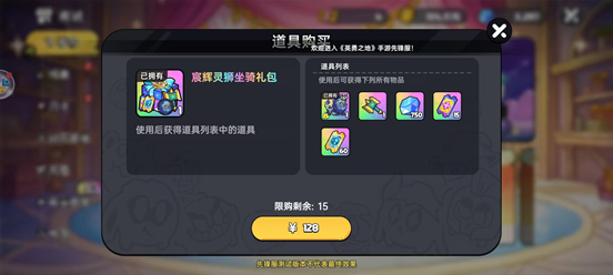 一个坐骑礼包是128,里面包含了一个小狮子,一个改造锤,750钻石,15祈愿卷,60附灵卷,第一次购买礼包还可以额外获得5个兑换币。买五个刚好可以获得5+1+3+5+7+9=30个个坐骑兑换币,可以拿下10兑换币的大狮子和15兑换币的马鞍,马鞍能为玩家提供增伤属性。多出来的小狮子可以挂最高价到交易行上卖,以此来赚取猫币购买其他物资。
