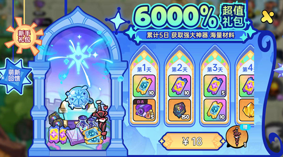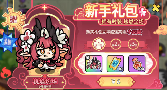 没什么好说的,每个游戏必备的6r新手礼包。6r就能让你在第一天获得神级pve角色小恶魔,同时还能获得一个好看的皮肤,后续两天也能为你提供一定的资源。