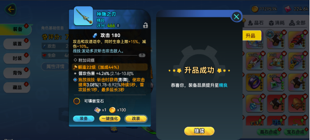 点击装备信息界面的改装按钮消耗对应品质的晶石,提升装备的品质。升品的装备可以获得一条新的随机属性或技能。