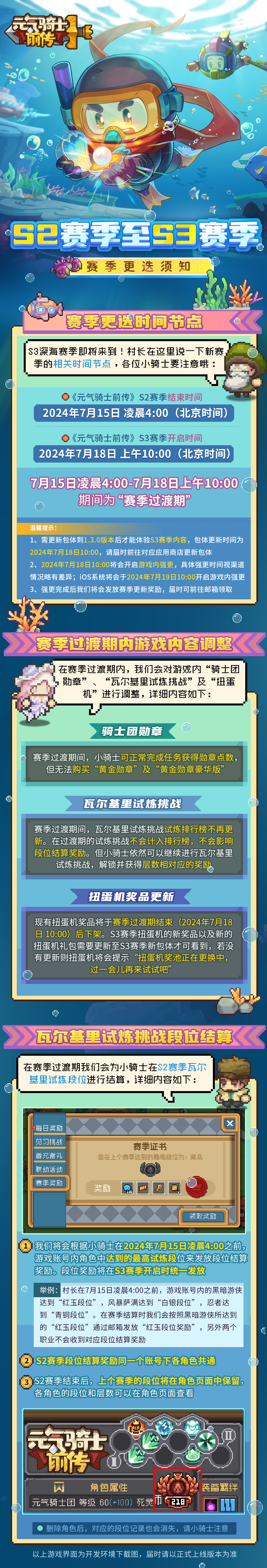 小骑士们,S3深海赛季将于2024年7月18日上午10:00上线!话不多说,来看看本次的赛季更迭须知吧~