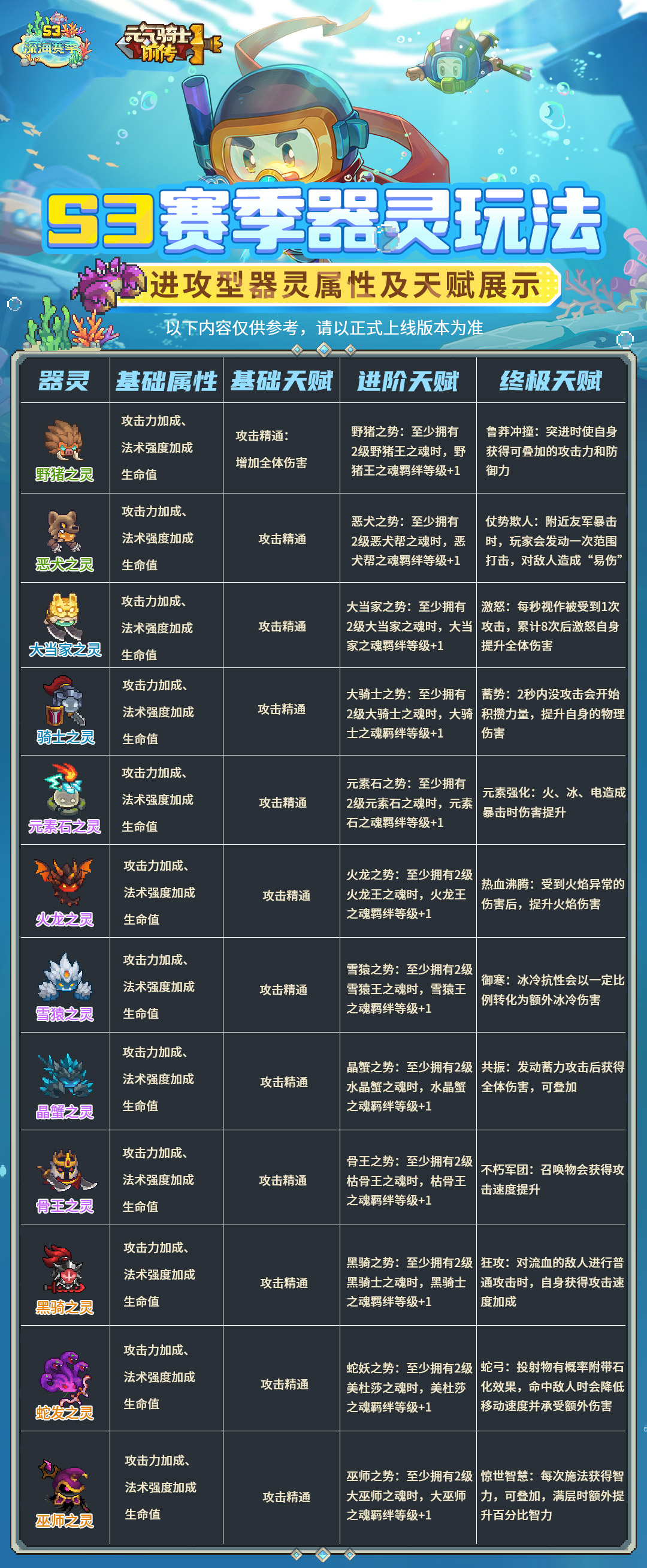 器灵系统为S3深海赛季上线的新系统,能够增加小骑士的基础属性数值(力量、敏捷、智力、攻击力、法术攻击力等);部分器灵还有独特天赋,能够为小骑士的冒险提供强大的增益效果。