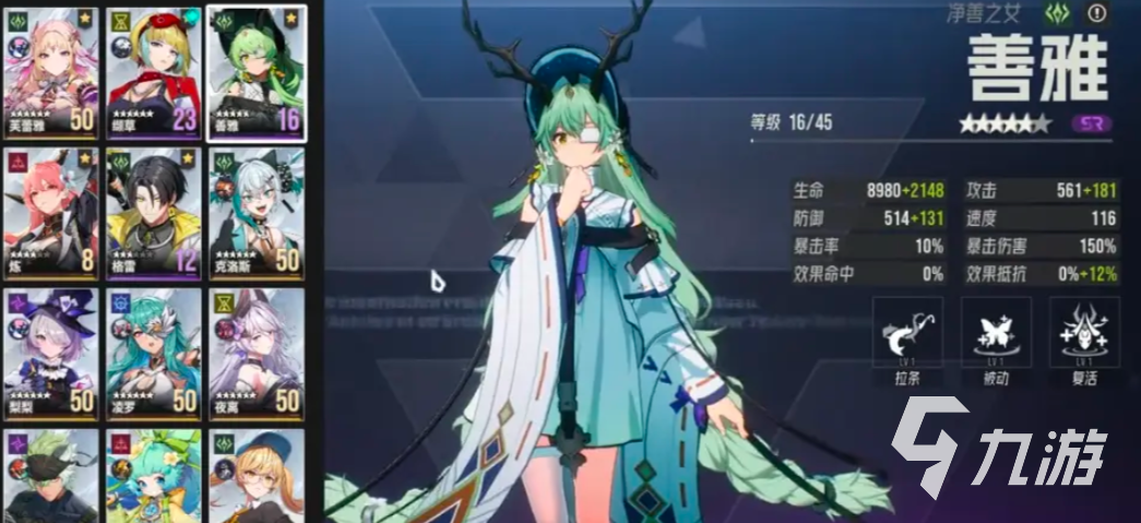 善雅有着高频率的治疗和净化,还有自拉条和抬血,是一个T0功能辅,她的“蔓舞”会用软藤抽打对手,增加自己30%的行动进度,她的“凝露”会储存力量,在回合结束的时候治疗两位生命值最低的队友,并净化掉他们身上的一个减益,自身血量每下降1%,就会让本次治疗则可以提升0.6%,她的必杀会为一名队友附加上1层庇护,并对其治疗,对已经阵亡的队友使用,能触发复活作用,不过也会导致大招会增加2回合冷却。