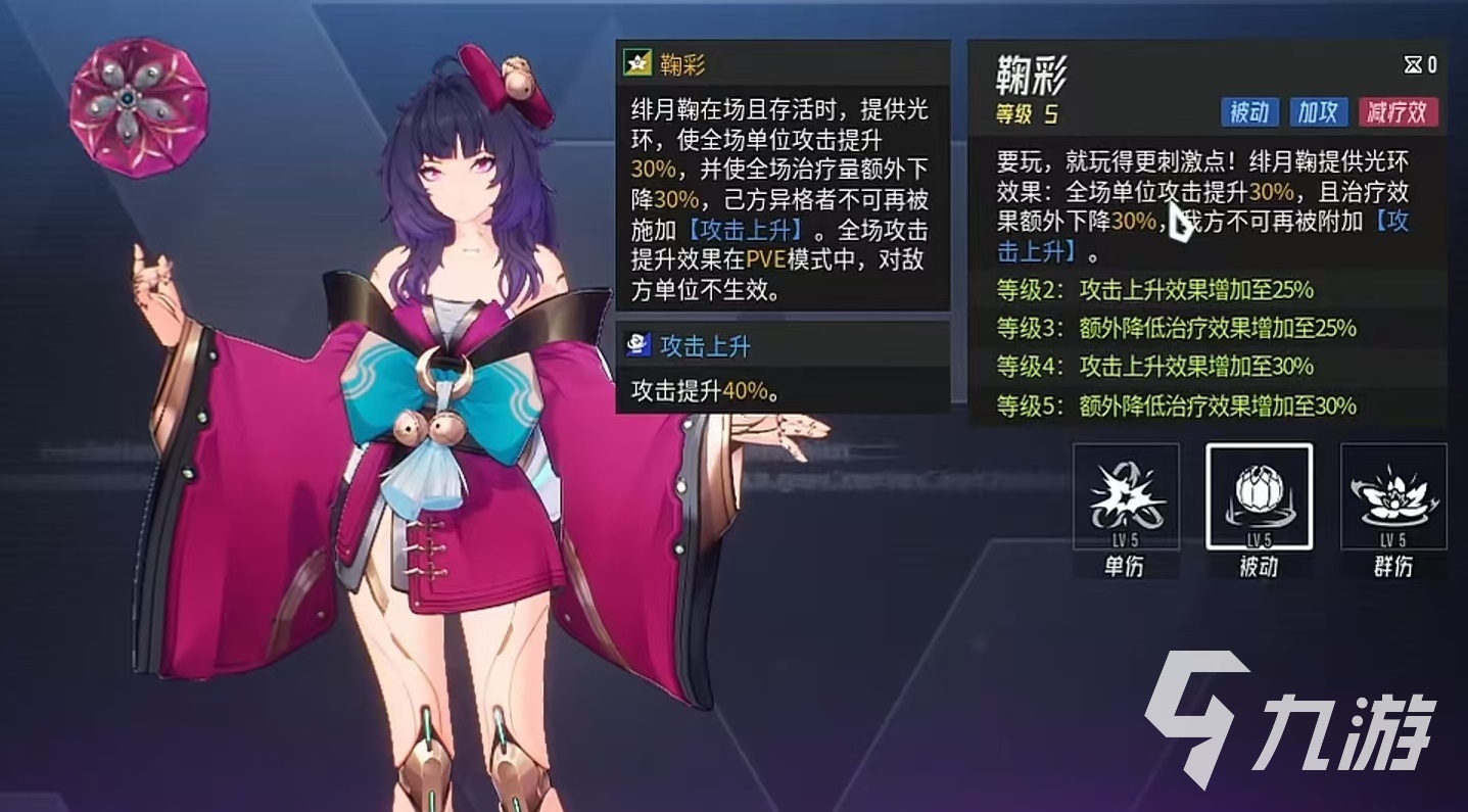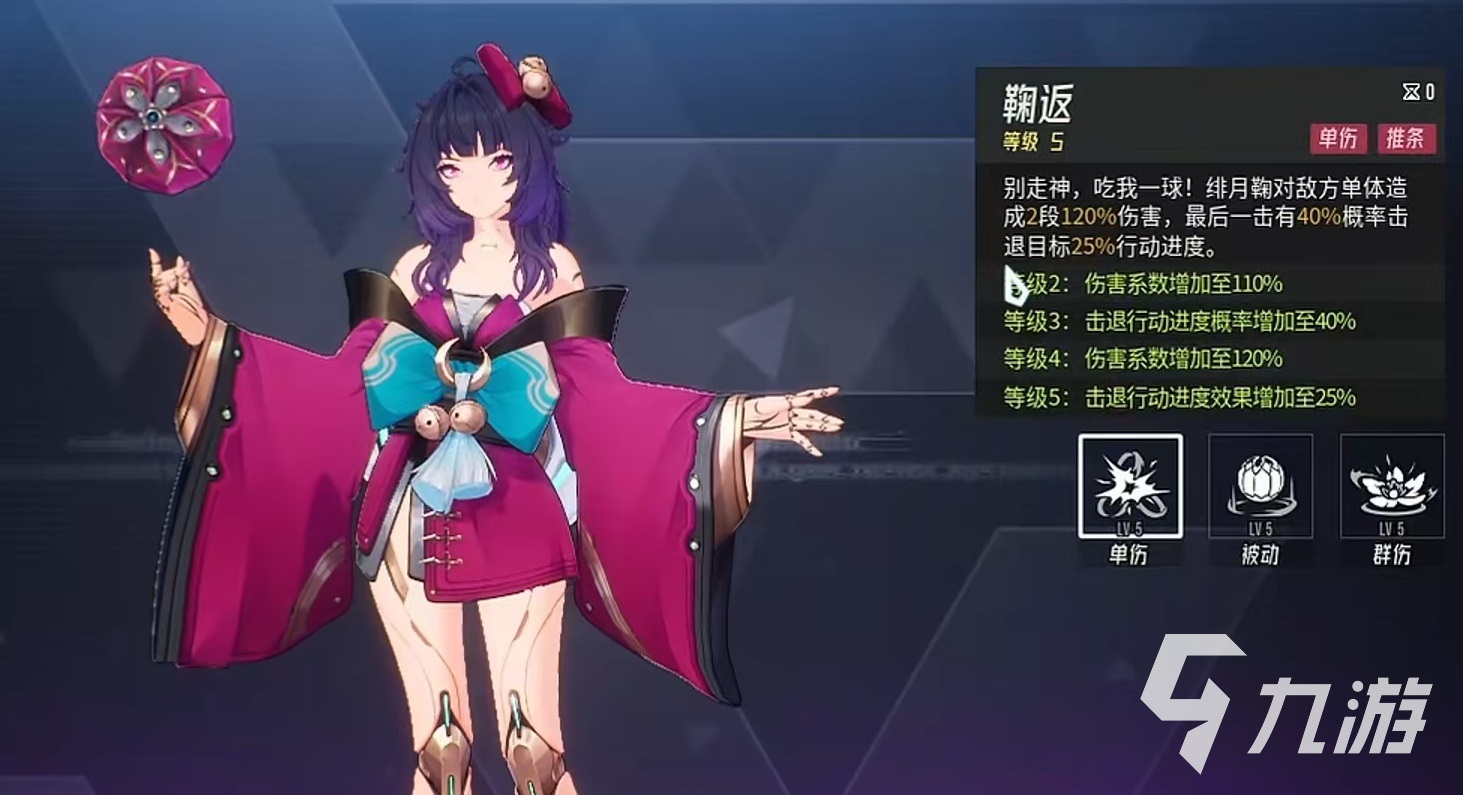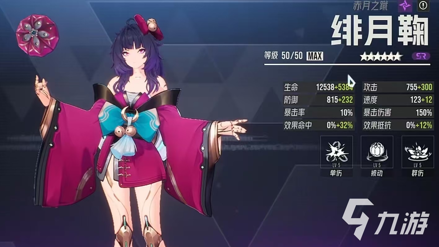 绯月鞠的一技能鞠返,可对单体敌人造成伤害,同时有几率减少对方的行动进度。二技能鞠彩,提供光环效果,场上的所有单位攻击力获得提升,但是受到的治疗下降,且己方全体单位无法被附加攻击上升效果。三技能爆裂手鞠,对全体敌人造成两段伤害,有几率附加石化和抵抗下降这两种状态。