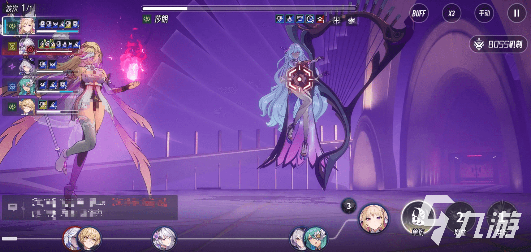莎朗是我们爬塔中会遇到的难度boss,她总共有3个阶段,第1阶段我们通过酣梦的“睡眠花苞”,以及芙蕾雅的技能二来抵抗住持续伤害,同时去压莎朗的血线,等压到还有一丝血的时候,让凌罗开大附加免疫效果,然后下一位角色平a收掉进入2阶段;在2阶段花骨朵会随机选择两位角色来附加标记,当被标记者行动时,花骨朵若没有处于不可行动状态,会眩晕一位并立刻行动一次;