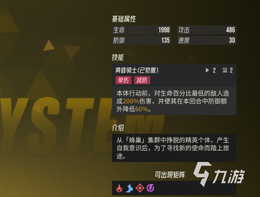 与其他多技能角色不同,黄昏骑士仅有一个核心技能,但该技能的实战效果极为突出。其技能效果为对战场上生命值最低的敌人造成高额伤害,并大幅降低目标的防御属性,且技能会在每个回合开始时自动触发,无需玩家手动操作。不过这个技能带有强制锁定效果,只要全场存在生命值偏低的目标,就会自动筛选出战场中生命值百分比最低的敌人释放技能,不会出现攻击偏差的情况。