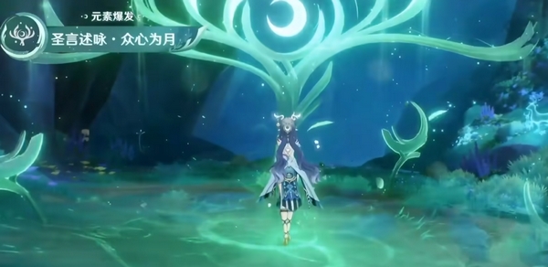 元素爆发一次性赐予“苍色祷歌”18层;如果此时身上已拥有“月咏”层数,或在施放后的15秒内获得“月咏”,会消耗这些层数,并进一步转换成更多“苍色祷歌”。“苍色祷歌”可以被队友用于触发绽放类反应时消耗,从而大幅提升伤害表现,层数越多提升越强。