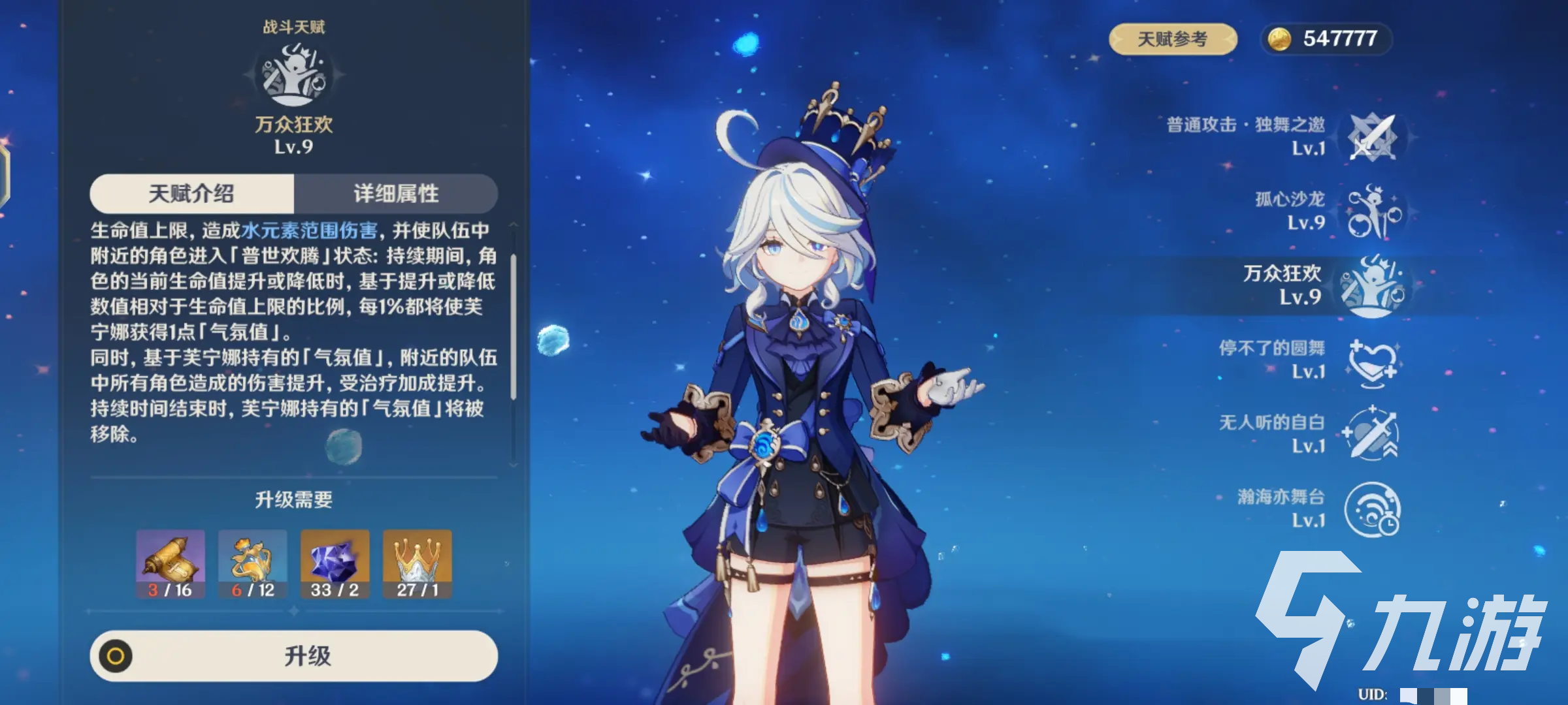 元素爆发根据生命值的波动可提高队伍整体伤害或治疗效果,作为全功能性的辅助,她不需要特定的配队,养成的成本也是比较低的,整体的培养价值非常高,在战斗中的实用性也是显而易见的,可搭配基本所有的水系队伍使用。