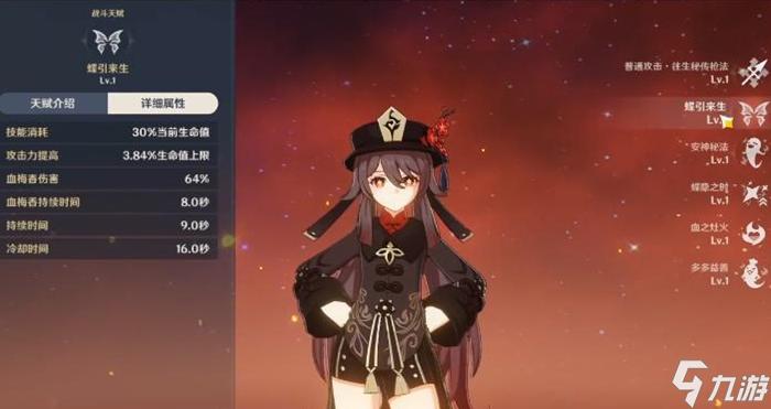 胡桃基础属性出众,一命重击对敌人伤害较强,且在E技能状态下,一命不消耗任何体力。二命附带血梅香让敌人每4秒遭受一次火元素伤害,伤害将近2.5w,更能提高搭档暴击概率!六命更是保命绝招。当受到死亡攻击(低血)时,其不会死亡反而会将抗性提高两倍,暴击提高一倍!其E技能也很是惹人眼球,即开即用,大幅度的攻击力提高,且附带火元素伤害。