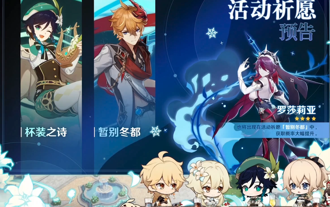 首先我们可以得知,1.4即将复刻我们高人气的温迪和公子,并且还有新的四星角色罗莎利亚,她也将在公子池子中出现。