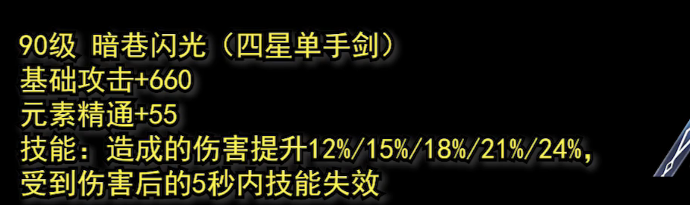 随后是我们的暗巷系列单手剑,我们可以看到,这把武器的90级基础面板奇高,作为一把四星武器,它竟然只比五星的单手剑武器风鹰剑低12点的攻击力加成。已经算是这个游戏的第二攻击面板了,这意味着我们平民的班尼特要起飞了。大部分没有五星风鹰剑的平民班尼特在平时没有氪佬那么高的攻击力加成,但当我们有了这把1.4的新四星武器,我们的班尼特也可以享受到氪佬一般高加成的攻击力了。所以这把暗巷单手剑的性价比很高,很厉害,十分推荐抽取。
