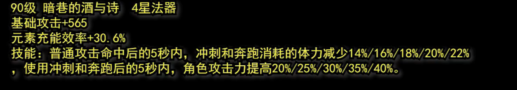 然后是我们暗巷系列法器,我们可以看到,它有着90级565的基础攻击面板,副属性是增加角色的元素充能效率。天赋是普攻攻击命中后的5s内,角色冲刺和奔跑所需的体力将会减少,反之在奔跑或者冲刺过后,角色自身的攻击力会增加。这个天赋属性是具有一定输出能力的武器,但小编认为效果还是太过一般,不算厉害。如果你没有四星的匣里日月和流浪乐章,那不妨抽取这个武器一试,但是如果你已经有这两种输出法器了,就完全没有必要抽取了。当然如果想要收藏一下,还是可以试着抽取一下的。总之,暗巷的新法器,总体而言表现过于一般。