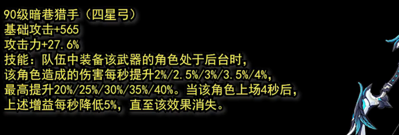 最后是我们的暗巷系列弓箭武器。我们可以看到,暗巷弓箭在升到90级的时候,拥有565的基础面板,副属性是提升角色27.6%的攻击力。天赋效果为队伍中装备该武器的角色处于后台时,该角色造成的伤害每秒提升2%/2.5%/3%/3.5%/4%,满精最高提升到40%。该角色上场4秒后每秒降低5%,直到效果消失。我们可以看到,这把新弓箭非常适合后台角色,比如菲谢尔就是很适应的角色,能在后台提供不错的输出,总体效果很不错,非常值得一抽。