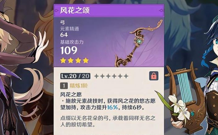 这是一个4星武器,其基础攻击值500多,元素精通值160多。更令人高兴的是,它可以通过活动免费获取。一般建议刚玩原神的玩家选择4星武器。而风花之颂就是4星,值得新手拥有哦。