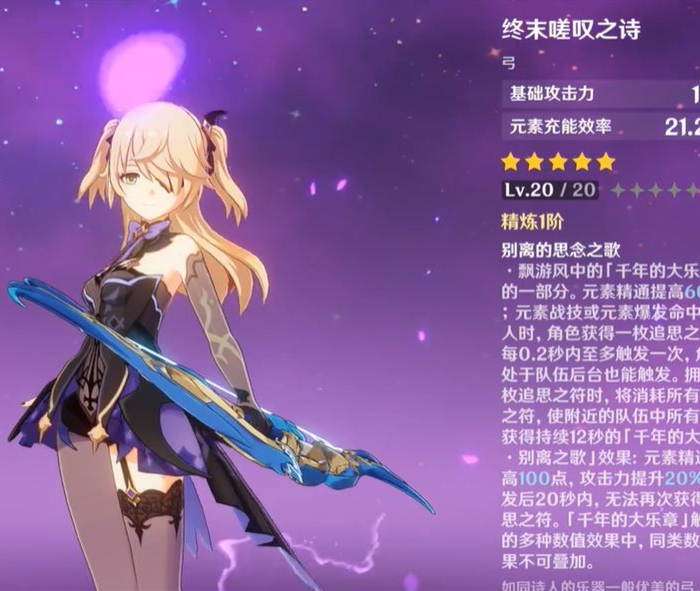 不同于风花之颂免费获取,终末嗟叹之诗需要从卡池中获得。但其各方面的属性值是不错的,是一个五星级弓箭类武器。更重要的是它的元素充能高达55%,适合温迪使用。