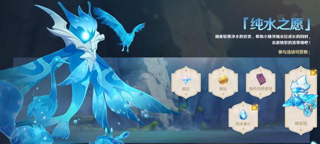 风花节纯水之愿是新玩法,玩家参与这一玩法,将耗费自身体力,每天可以参与一次。玩家每天参与纯水之愿之后,可以拿到一个纯水真心,获得四十体力。