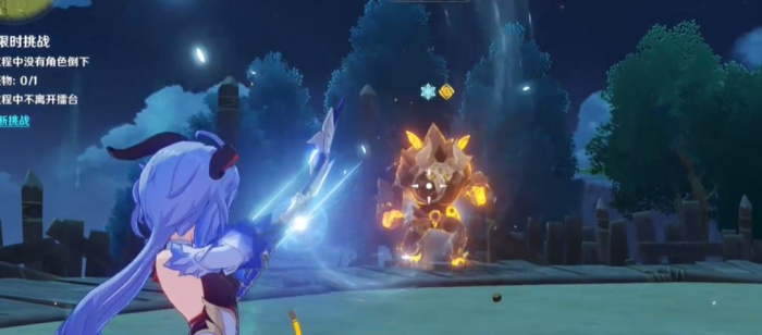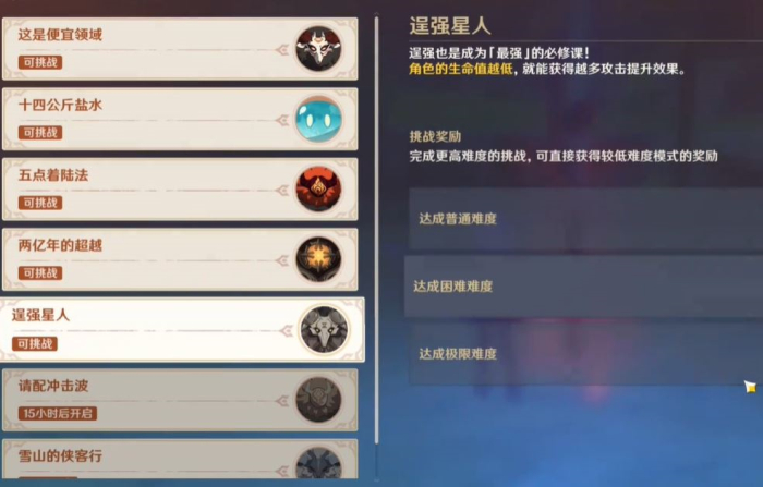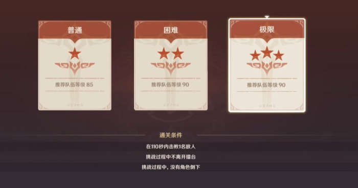 挑战逞强星人分为三个难度。最难的关卡过关条件:玩家需要在110秒内击败一个丘丘岩盔王;角色不能倒下;不能离开擂台。