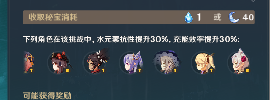 接下来是角色配置,甘雨、罗莎莉亚、迪奥娜、胡桃、刻晴、丽莎、皇女、诺艾尔在这个关卡都有水元素抗性加成和充能效率的加成。