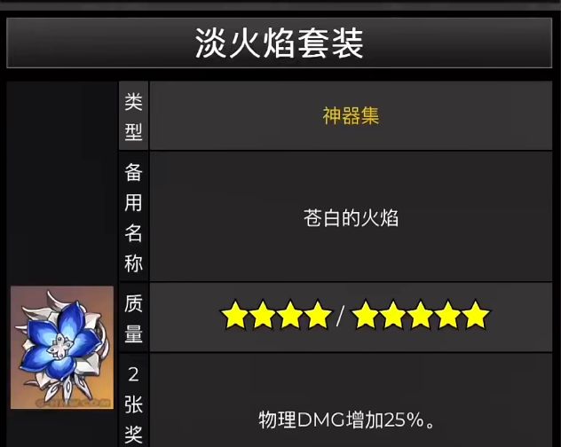 苍白之火原名“终末愚戏”,在以前的版本由于该装备不太热门,官方及时下架进行了调整:物理套的减伤以及伤害数值在整体不变的情况下触发条件变得更为简单,由原来的三次触发变成了两次触发,可谓是一波小加强。