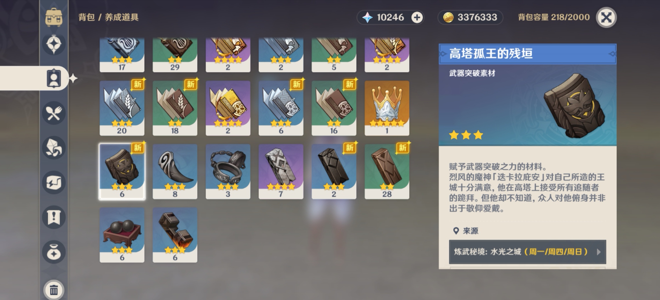 松籁响起之时突破材料列举如下,20突破40级为:五个高塔孤王的破瓦+五个沉重号角+三个破损的面具以及10000摩拉。40突破50级为:五个高塔孤王的残垣+十八个沉重号角+十二个破损的面具以及20000摩拉。50突破60级为:九个高塔孤王的残垣+九个黑铜号角+九个污秽的面具以及30000摩拉。