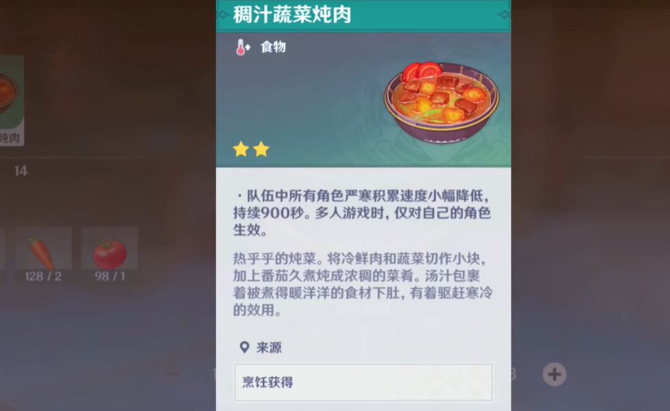 料理效果:这个料理会让全体队员积累寒冷的速度变慢。也就是说,在躲猫猫活动中,使用这个食谱会让体力掉的更慢。在多玩家活动中,这个料理仅对自身角色起作用。