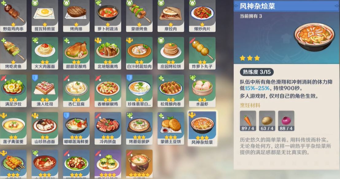 料理效果:这个料理会让全体队员滑翔和冲刺体力消耗减少15%到25%。在多玩家联机活动中,这个料理仅对玩家拥有的角色生效。