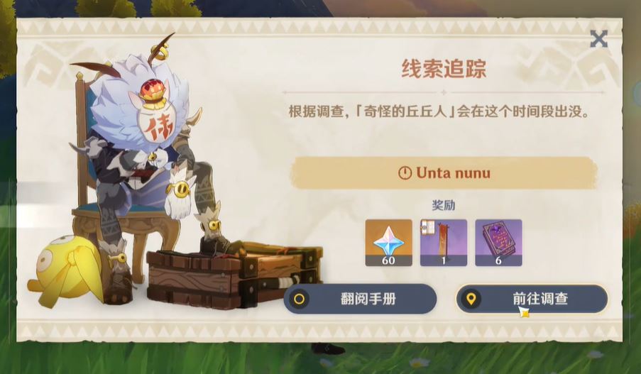 玩家首先在折箭觅踪活动页面选择第三天的调查点,点击“前往调查”。到达目的地后,玩家可以在悬崖边找到【警惕的丘丘人】。玩家要和这个丘丘人对话,然后领取委托任务。委托任务是要求玩家按照指引前往指定地点,战胜怪物,替丘丘人报仇。