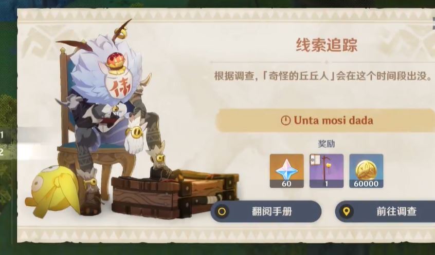 查找丘丘人语言手册,“upano”是飞虫、云、飞禽的意思。玩家从蝴蝶、鸽子腿中选一样提交给它,就算完成丘丘人的委托任务了。