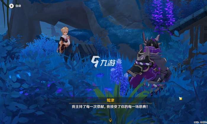 第一天,到上图位置和npc鹫津对话,然后他会让我们参拜神龛说可以拿到奖励,接着我们就按照他的指示去参拜异人龛三次,这时候神龛会出现三个悬浮的紫色光球,然后我们回头去跟鹫津对话,可以得知我们接下来每天过来参拜一次,就可以拿到一个奖励,有三个紫色的光球,我们就需要参拜三天。