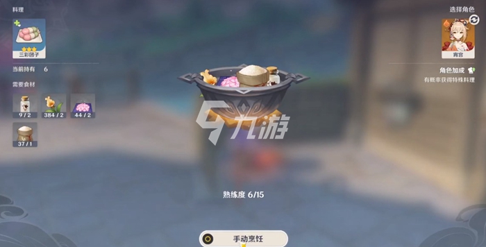 在收集到所有的材料之后就可以进行烹饪了,这里需要注意的是,我们在烹饪三彩团子时必须要选择宵宫作为辅助角色才可以获得,而且几率也不是很大。所以建议大家要多备一些材料。
