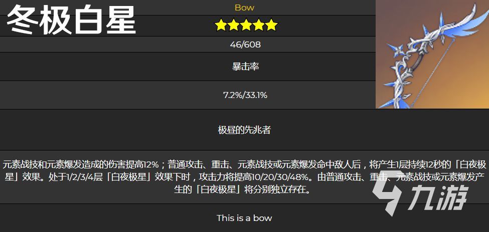 冬极白星在游戏中属于是一款五星级的弓箭类型的武器,预计会在未来的2.2版本中正式上线,其属性主要是帮助角色带阿里攻击力以及暴击率的提高。