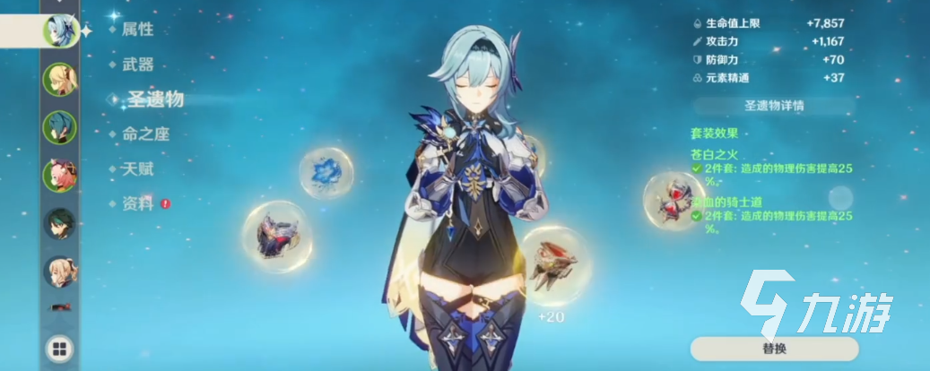 圣遗物方面,小编推荐骑士2、苍白2,或者也可以直接苍白4件套都是可以的。骑士2和苍白2的搭配优点是比较的稳定,缺点就是上限比较的低,比不上苍白4件套。
