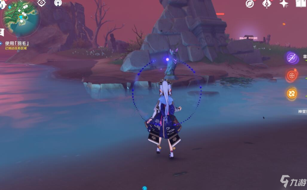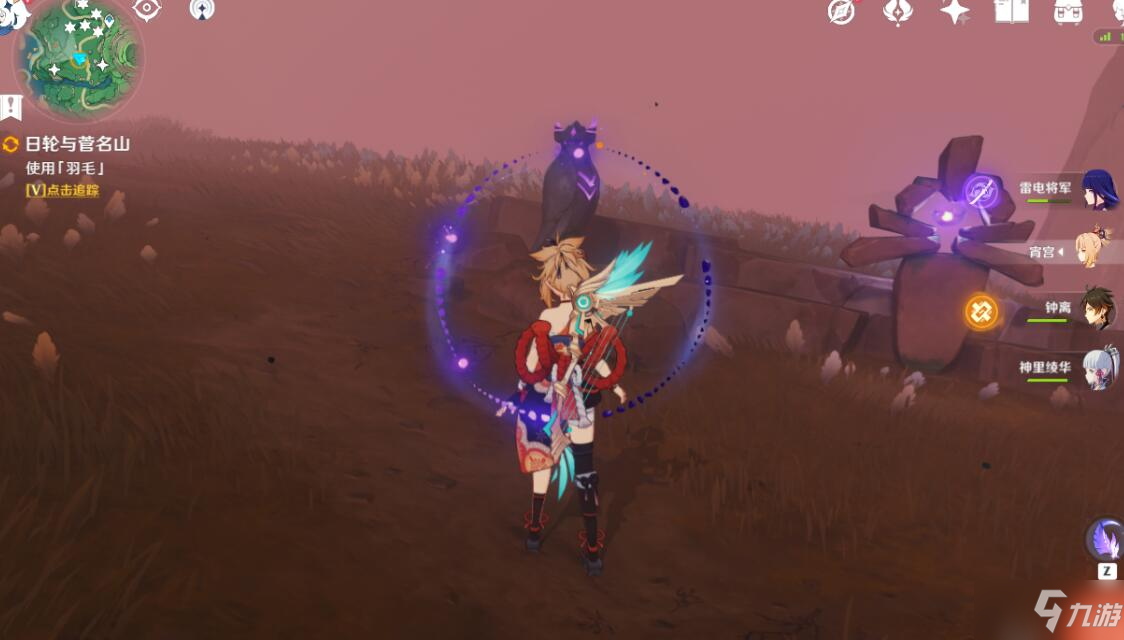 对话完结束,继续往前走,地图上的迷雾消失后,传送到茂知祭场,前往惑饲滩,对着这个刻像使用羽毛,会出现一群丘丘人。
