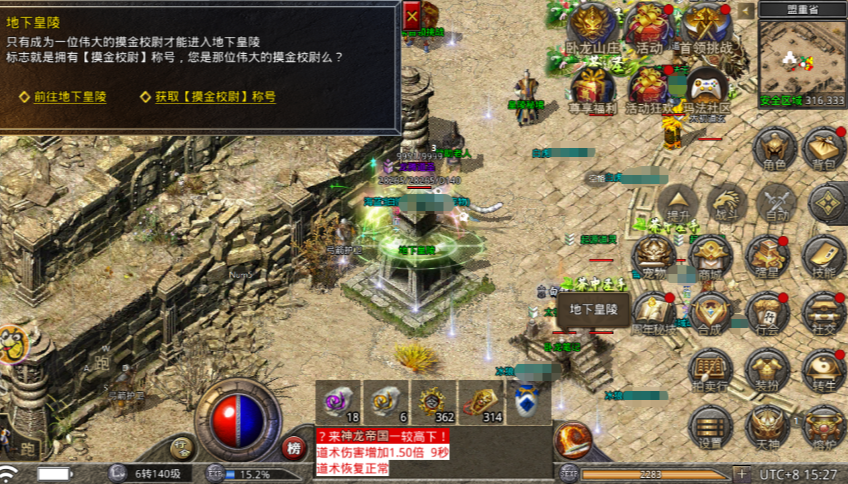 皇陵威远将军:该首领伤害、血量、属性等均次一级于皇陵至尊圣皇,前期道法战都可以尝试单挑打,扛不住可以通过石阶与守卫宝宝的配合进行卡住打,但伤害较低的情况下依然建议组队打最好,减少时间消耗;