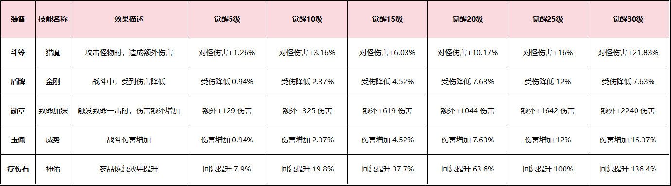 特殊强化技能是装备觉醒最重要的一个提升点,觉醒每提升5级都能提升特殊强化技能的属性,以下为特殊强化技能的提升数据: