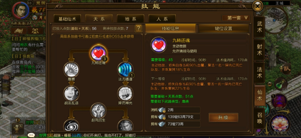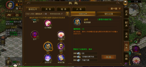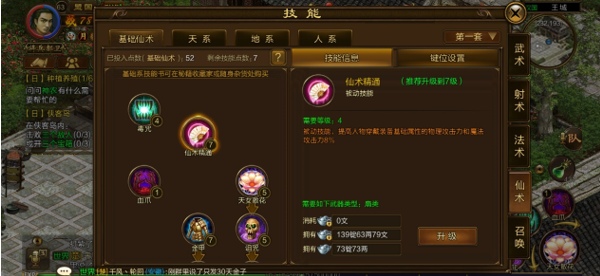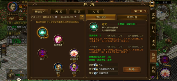 除了基础仙术的技能以外,还有天系、地系、人系的技能。目前只开放天系,我们先看看天系的技能。